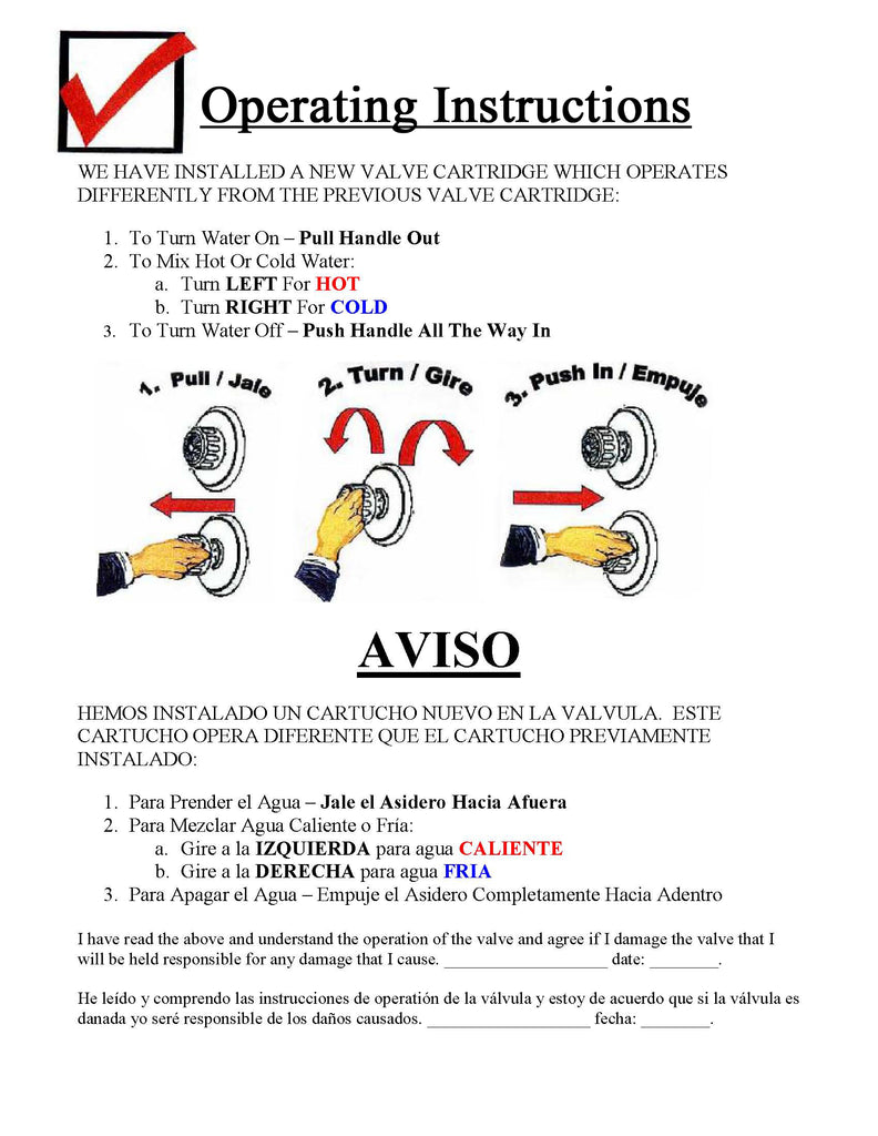 Instructions for operating your new NoMix valve, as shown below, are included with each order. The instructions are in English and Spanish, and for your convenience a downloadable version is available here.